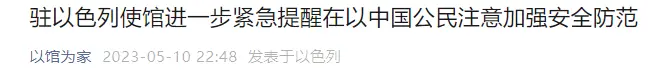 5月10日,中国驻以色列大使馆微信公众号“以馆为家”发布紧急提醒: