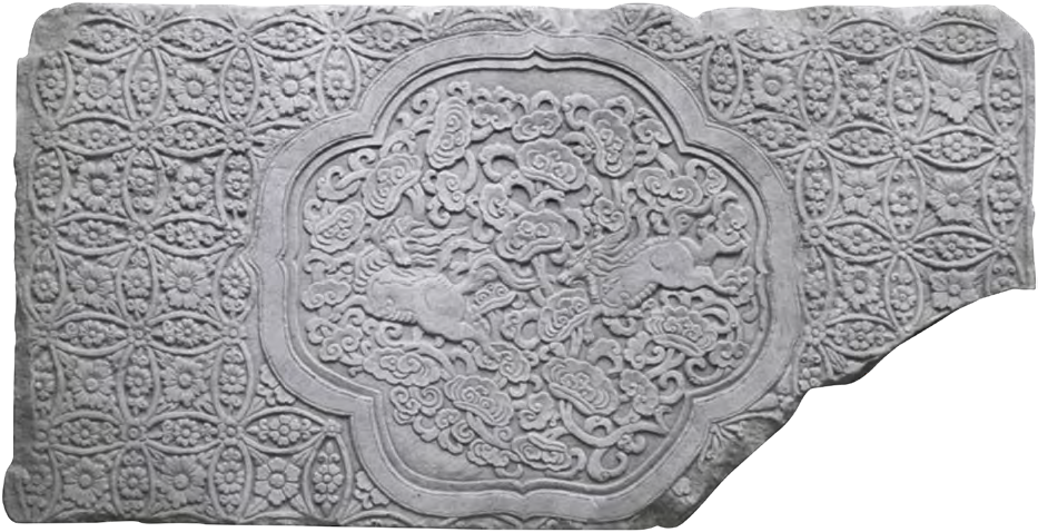 北京地区出土的石构件较多,主题纹饰有走龙、莲花瓣、宝相莲瓣等,此件主题纹饰为灵芝、麒麟,姿态生动,虽然残缺,仍能显示出元代雕刻工艺的高超水平。
