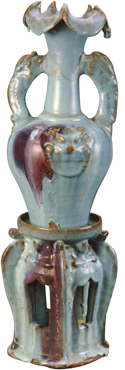 元大都发现了不少钧窑瓷器。其中,后桃园遗址出土的这件钧窑天蓝釉贴花兽面纹连座双耳瓶,器形高大,装饰精致,艳丽的紫红斑形成绚丽的色调,是元代钧窑瓷器的代表作。