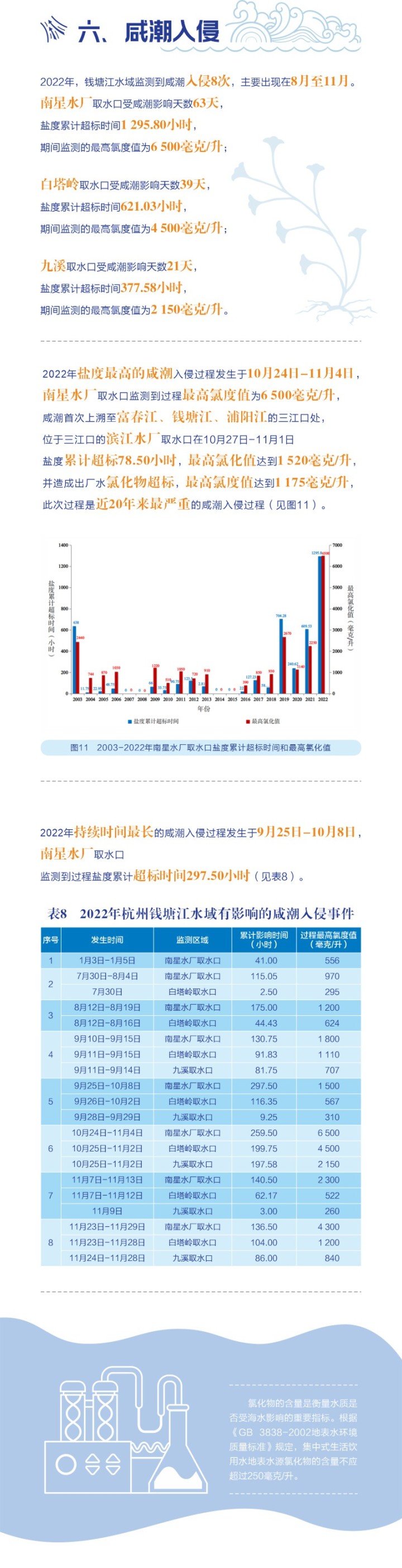 去年,钱塘江水域监测到咸潮入侵8次,主要出现在8月至11月。