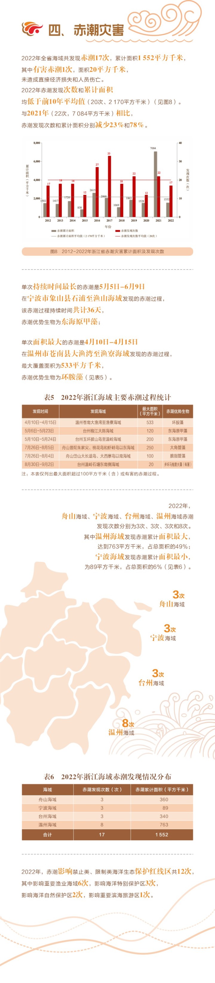 去年浙江赤潮发现次数和累计面积均少于前10年平均值(20次、2170平方千米)。