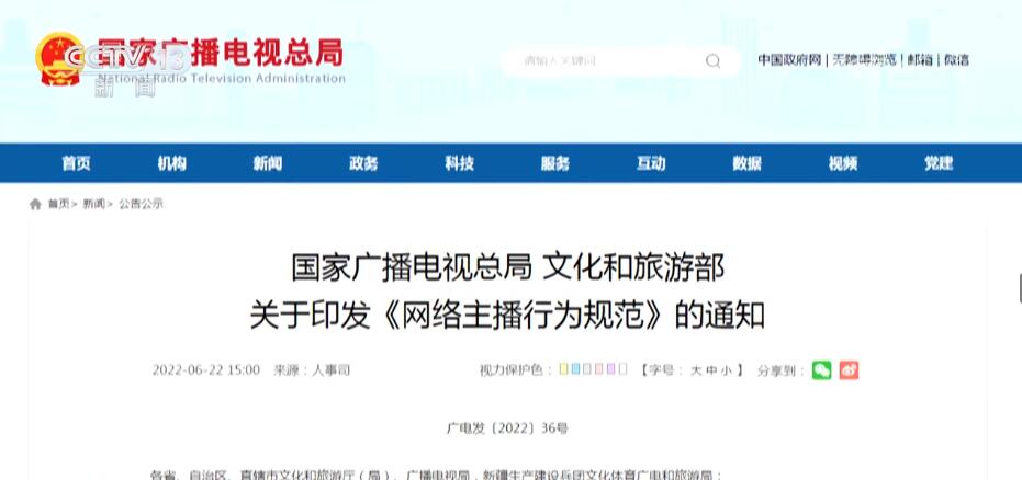 2022年6月22日,国家广播电视总局、文化和旅游部联合发布了《网络主播行为规范》,对网络主播行为进行了详细规范。
