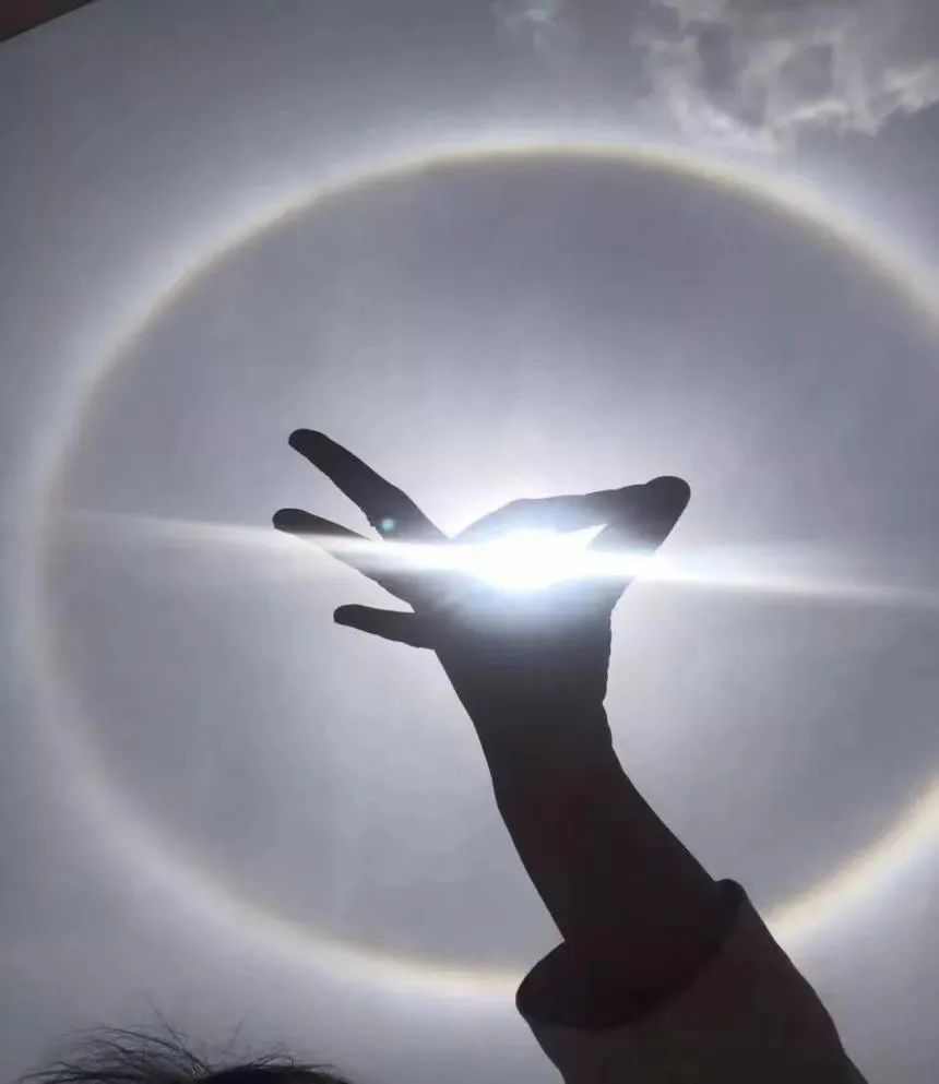 还有网友开始对着日晕比手势、拿道具错位拍照创意满满!!!