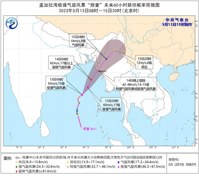 大风预报:13日至14日,孟加拉湾中部和东北部海面、缅甸西北部沿海、孟加拉国东部沿海将有9~11级大风,部分地区或海域风力可达12~14级,“穆查”中心经过的附近海面或地区的风力有15~17级,阵风17级以上。
