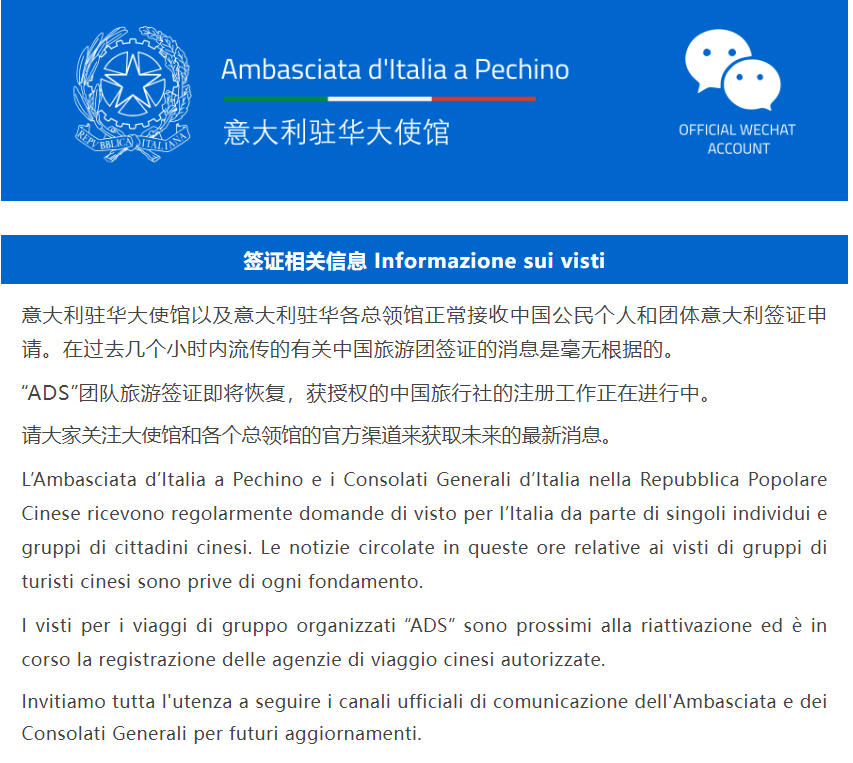 据意大利驻华使馆5月13日消息,意大利驻华大使馆以及意大利驻华各总领馆正常接收中国公民个人和团体意大利签证申请。在过去几个小时内流传的有关中国旅游团签证的消息是毫无根据的。“ADS”团队旅游签证即将恢复,获授权的中国旅行社的注册工作正在进行中。
