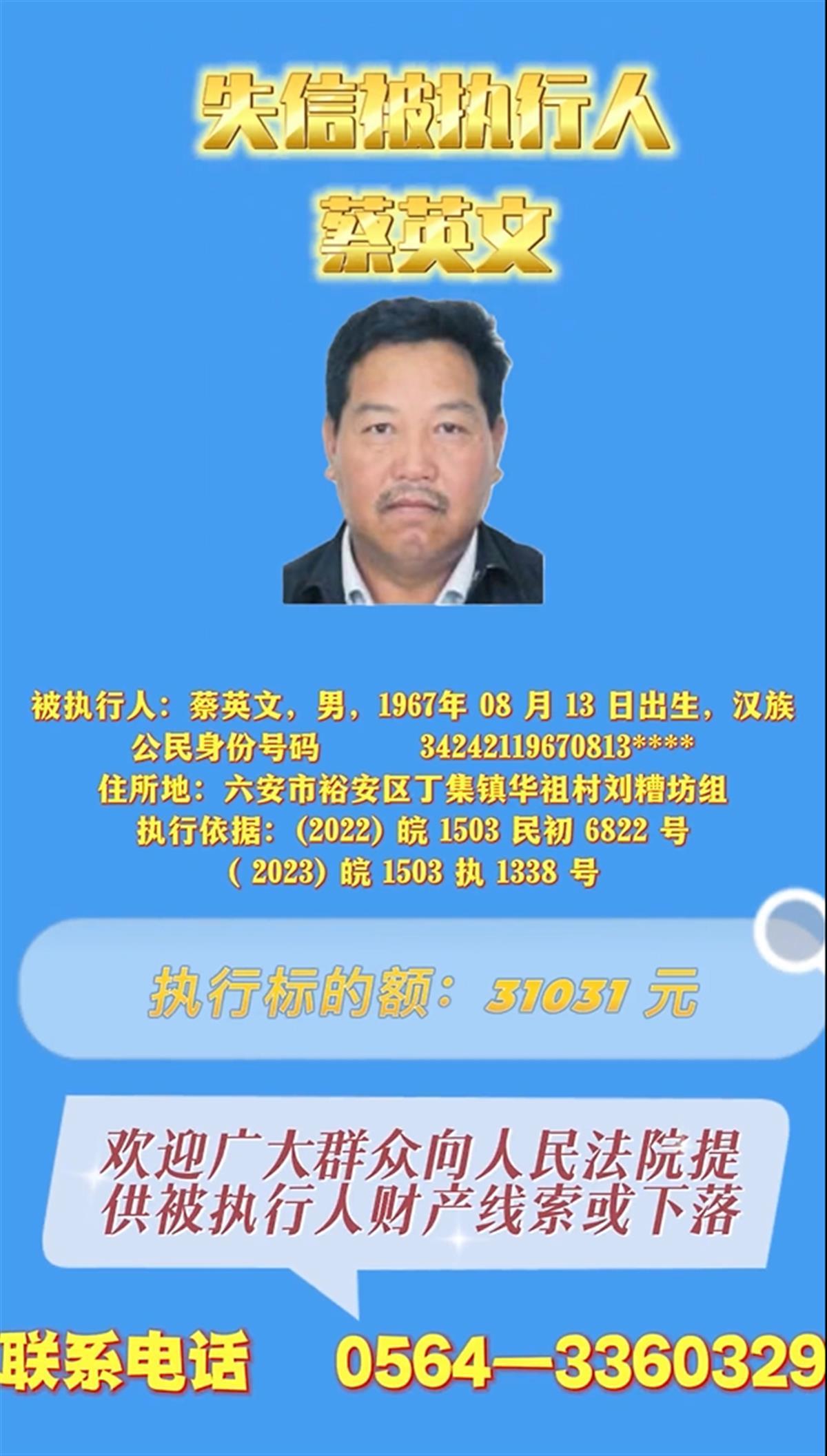 5月12日,安徽省六安市裕安区人民法院发布了一组失信被执行人信息的公告。其中有一名失信被执行人名为蔡英文,男,1967年生,六安市裕安区丁集镇人。蔡英文的执行标的额为31031元,法院欢迎广大群众提供被执行人的财产线索或下落。