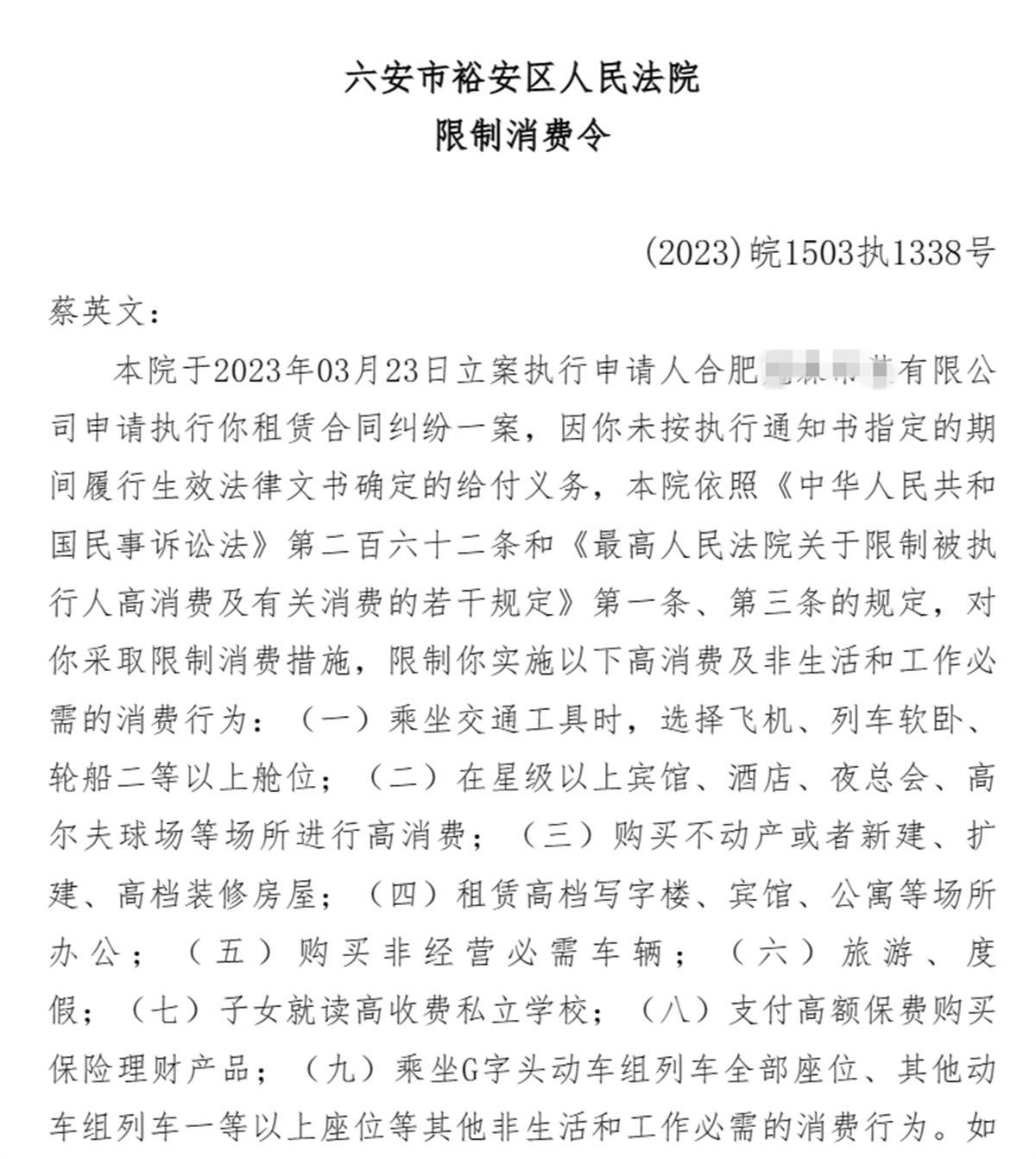此外,裕安区人民法院还对蔡英文下达了限制消费令,限制措施包括乘坐飞机及G字头动车、在星级以上酒店高消费、购买不动产或新建装修房屋、旅游度假、子女就读高收费私立学校等。如其违反限制消费令,法院将予以罚款、拘留,情节严重构成犯罪的,依法追究刑事责任。