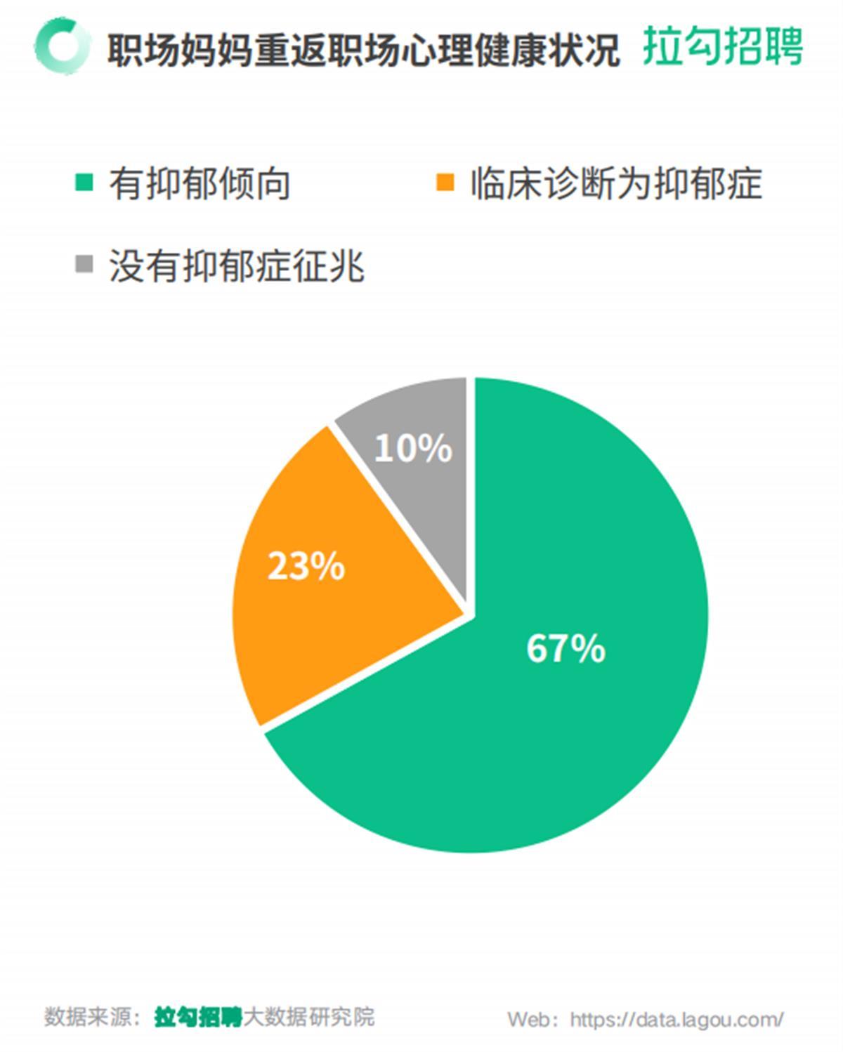 《报告》显示,67%的受访职场妈妈在重返职场后有“抑郁倾向”,23%受访职场妈妈曾被临床诊断为“重/中/轻度抑郁症”,没有任何抑郁征兆占比10%。