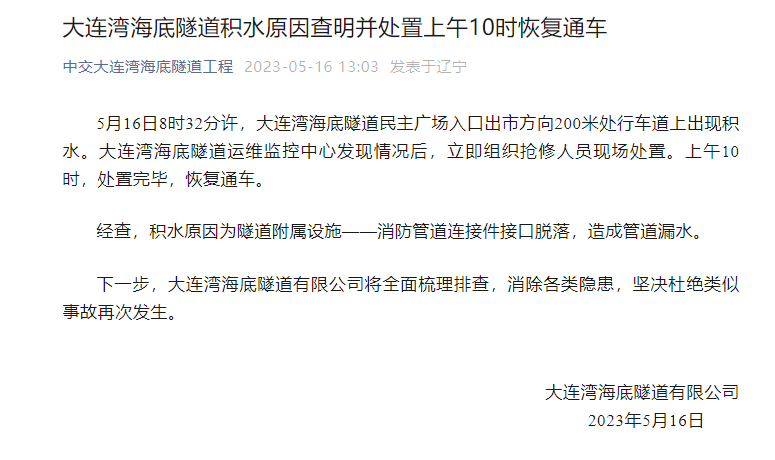 5月16日8时32分许,大连湾海底隧道民主广场入口出市方向200米处行车道上出现积水。大连湾海底隧道运维监控中心发现情况后,立即组织抢修人员现场处置。上午10时,处置完毕,恢复通车。