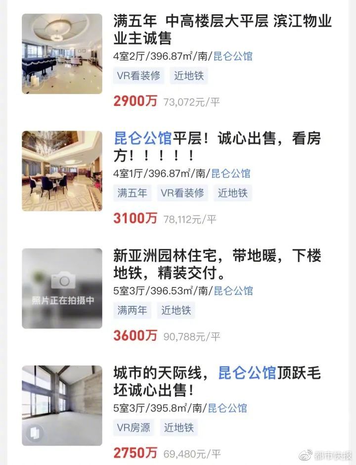而在某大型二手房app平台,现在小区内4套400方的挂牌房源,单价分别在6.9万元—9万元/平方米不等。