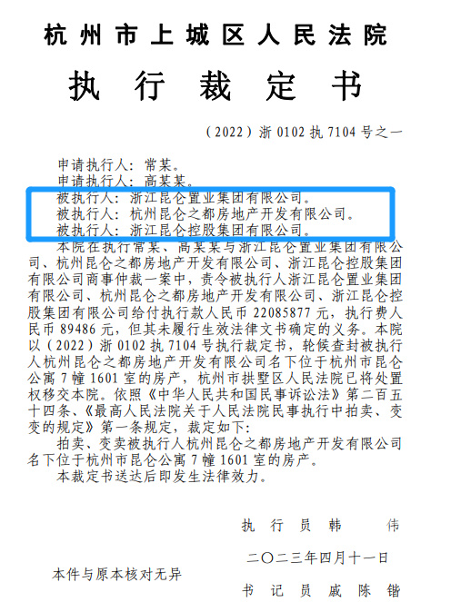 这套房子进入司法拍卖市场,是因为昆仑集团旗下多家公司与申请人存在商事仲裁纠纷,本应给付执行款约22085877元,执行费89486元,但其未履行生效法律文书确定的义务,所以拍卖了昆仑之都房地产开发有限公司名下这套房产用于抵债。