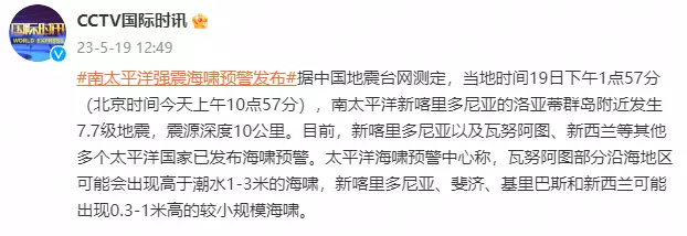 据中国地震台网测定,当地时间19日下午1点57分(北京时间今天上午10点57分),南太平洋新喀里多尼亚的洛亚蒂群岛附近发生7.7级地震,震源深度10公里。目前,新喀里多尼亚以及瓦努阿图、新西兰等其他多个太平洋国家已发布海啸预警。太平洋海啸预警中心称,瓦努阿图部分沿海地区可能会出现高于潮水1-3米的海啸,新喀里多尼亚、斐济、基里巴斯和新西兰可能出现0.3-1米高的较小规模海啸。