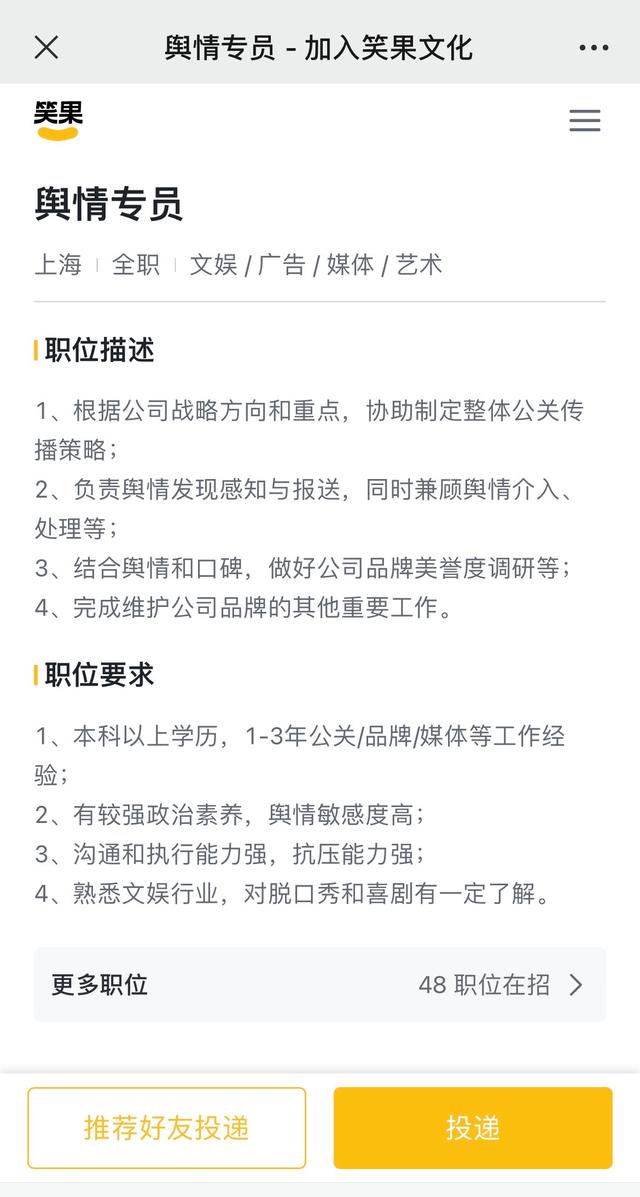 5月19日,有网友发现,疑似笑果文化发出了多条招聘信息,在社会招聘岗位中出现了舆情专员等岗位。职位要求包括有较强政治素养,舆情敏感度高等。