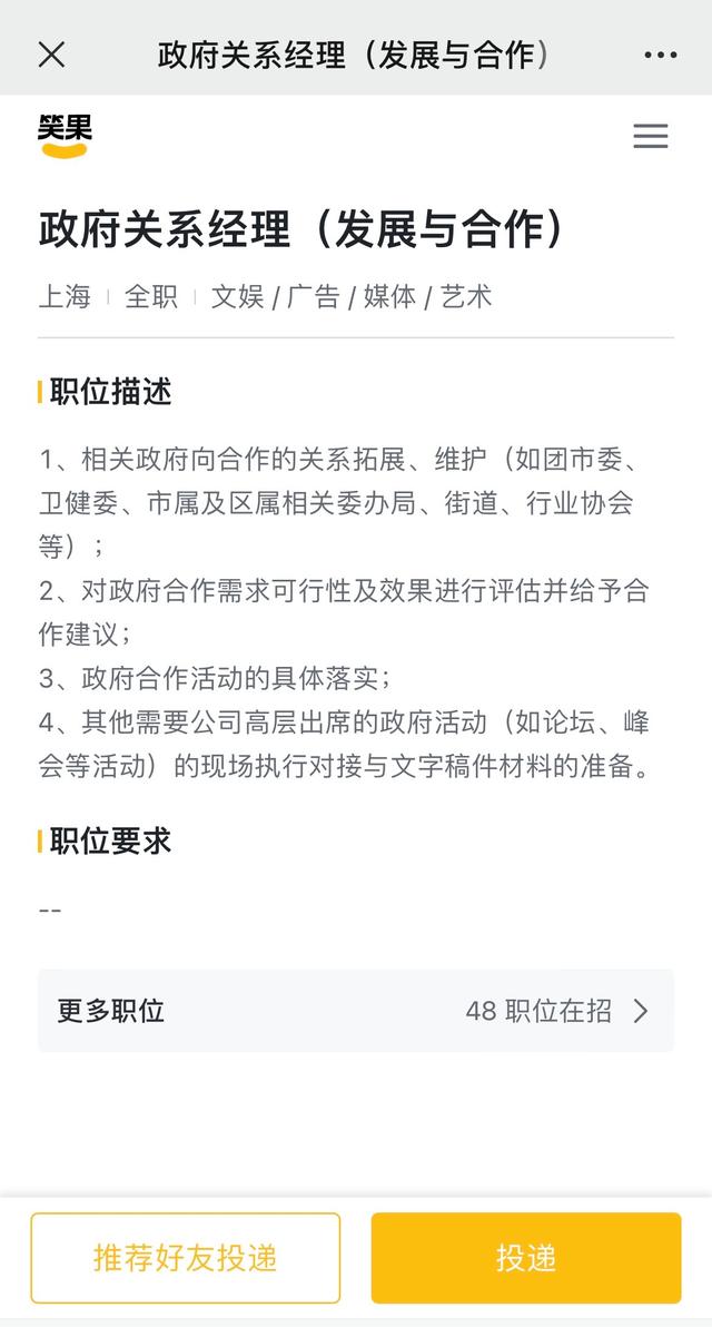 5月19日11时49分,扫描社招官网的二维码后,显示出笑果社会招聘的页面,招聘的职务中,有艺人商务、宣发导演、真人秀导演等,其中最引人注意的是舆情专员,政府关系经理这两个职位。