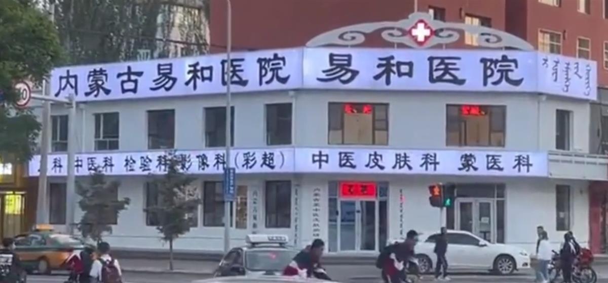 视频显示,一家名为内蒙古易和医院的门头招牌为白底黑字,下方的科室和业务介绍也是同样的字体。有网友留言表示“白底黑字跟殡葬风格一样”,也有网友反驳,认为医院只要能治病即可,门头只是引导地点,不必吹毛求疵。