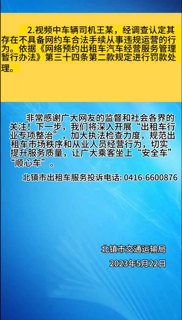 5月22日,辽宁锦州北镇交通运输局发布关于北镇市沟帮子火车站出租车视频事件调查处理情况的通报。