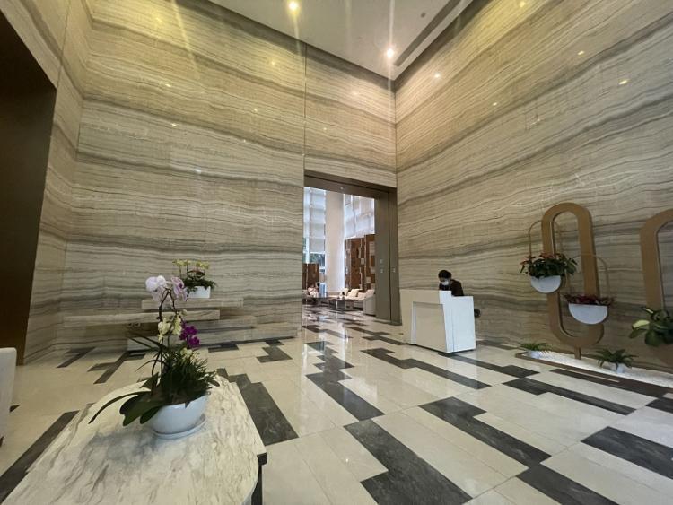 整个小区只有六栋住宅楼,每栋住宅楼均在一楼设置了一个宽敞的大堂供住户休憩,并放置有蝴蝶兰等植物作为装饰点缀。汽车可以直接开至大堂门口,住户通过刷卡方可通过乘坐电梯到达自己住宅所在的楼层。每个大堂配有一名管家提供专属服务,记者到访时恰逢大雨,有管家为住户撑伞至其上车。