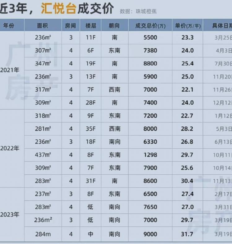 而早在这次开拍之前,网络上就有房产博主作出了成交价在1.1亿-1.2亿内的预测。周边房地产中介亦向记者表示,1.1亿属于正常市场价。据珠城橙蕉统计,在2021年3月至2023年3月间,汇悦台共有16次交易,其中成交单价在22.1万至31.7万间。在珠江新城2022年成交单价TOP10榜单中,汇悦台占据五个位置。而此次法拍成交价为1.11536426亿元,折合单价30.5万每平方米,在汇悦台的众多次成交单价中较高,但也没有突破近三年内的最高单价。