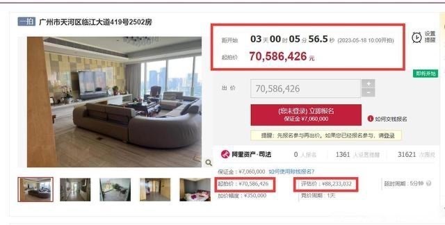 此次竞拍吸引了9位竞拍者。在开拍之前,广州天河区人民法院的竞拍公告和阿里资产拍卖平台曾介绍过该住宅的有关信息:该住宅系汇悦台小区419号25楼2502房,属于高层大平房,起拍价为70586426元,房屋建筑面积为365.89平方米,专有建筑面积为299.88平方米,户型为4室2厅4卫,西南朝向。