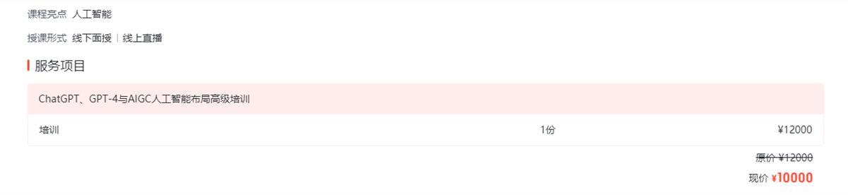 “1对1授课,共培训3天,每天授课6小时,线上收费1.6万元,线下收费1.8万元。”某培训机构顾问吴先生告诉极目新闻记者,近期推出的“AIGC和ChatGPT实战应用培训班”十分火热,零基础也可以学会AIGC的应用,可以线上直播授课,北京、上海、广州、武汉等城市也可以线下面授。
