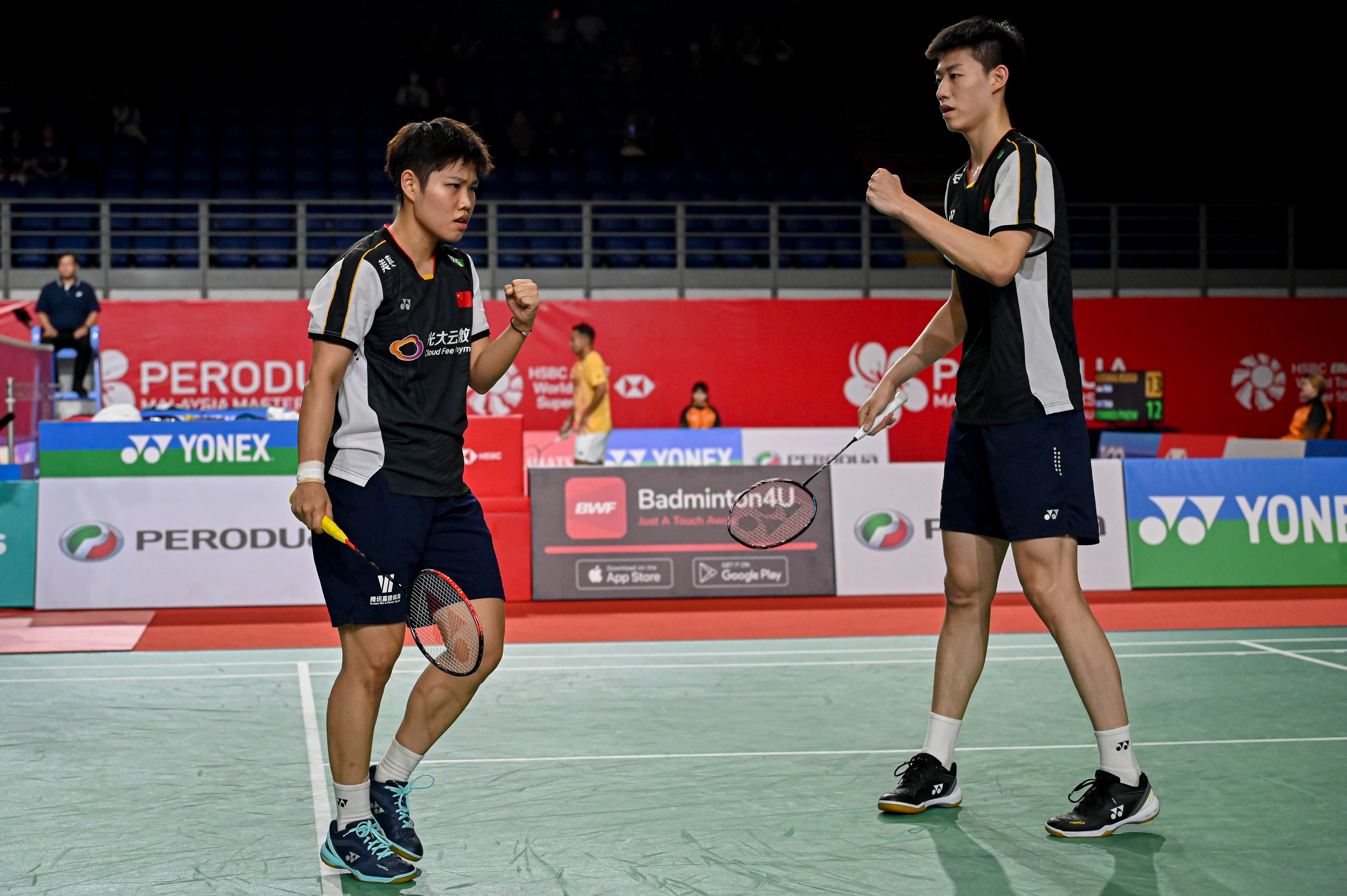 5月25日,冯彦哲/黄东萍(左)在比赛中庆祝得分。新华社发(颜泉春摄)