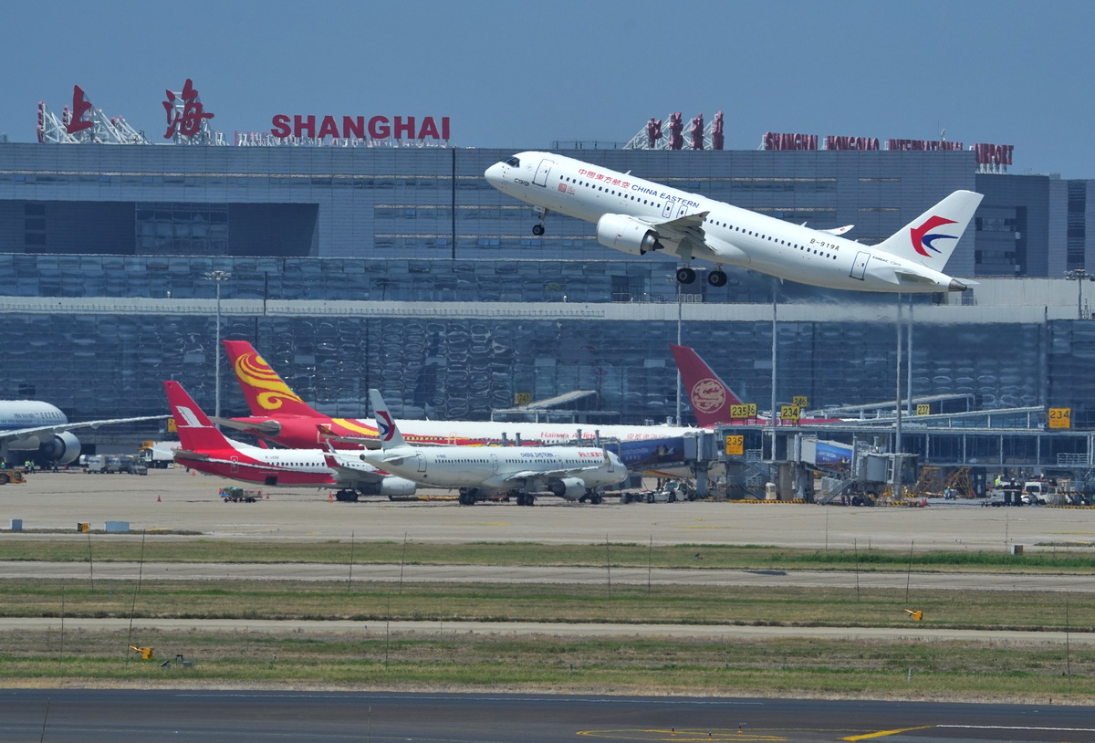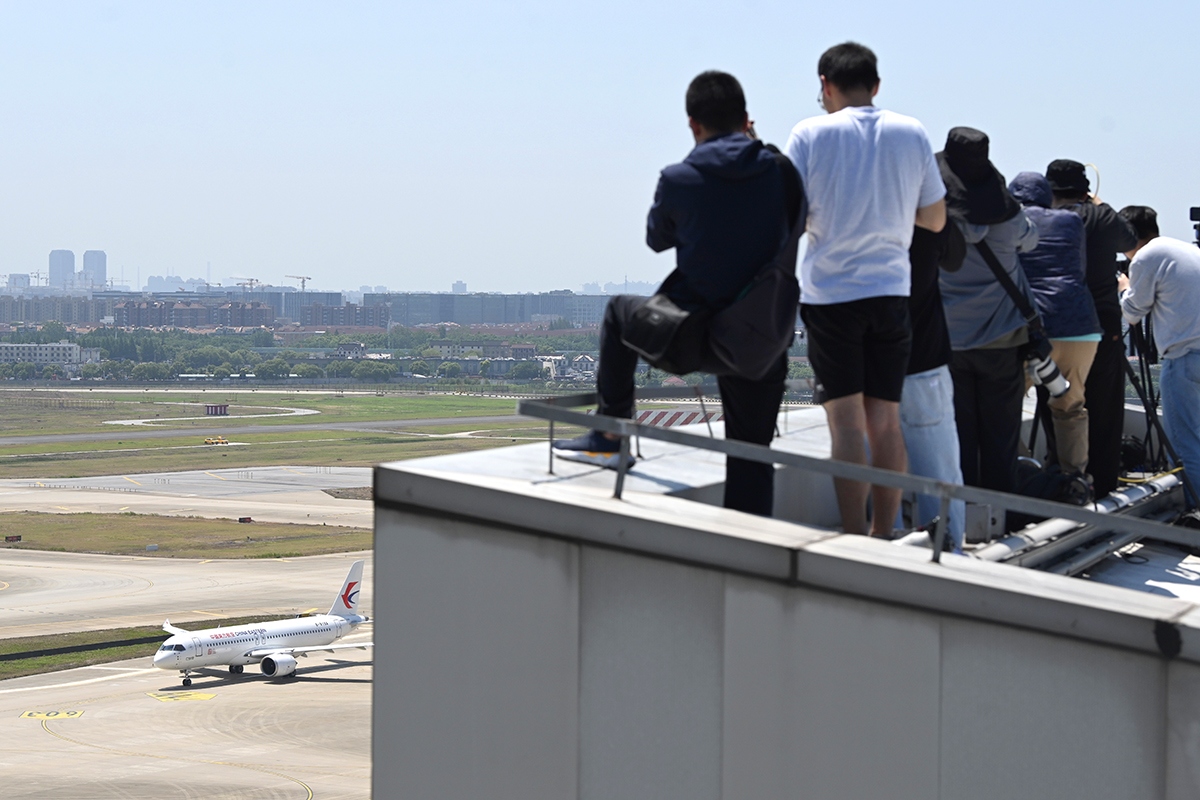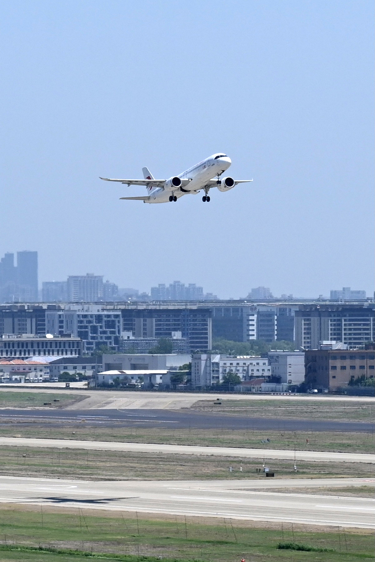 5月28日上午,C919客机在上海虹桥国际机场起飞。陈奕扬/IPSHANGHAI图