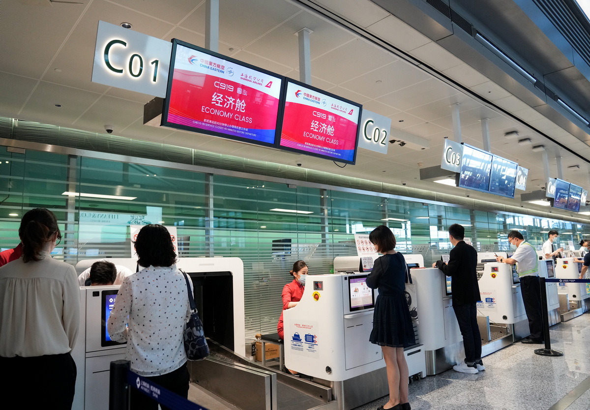 5月28日,旅客在上海虹桥国际机场航站楼办理登机手续。