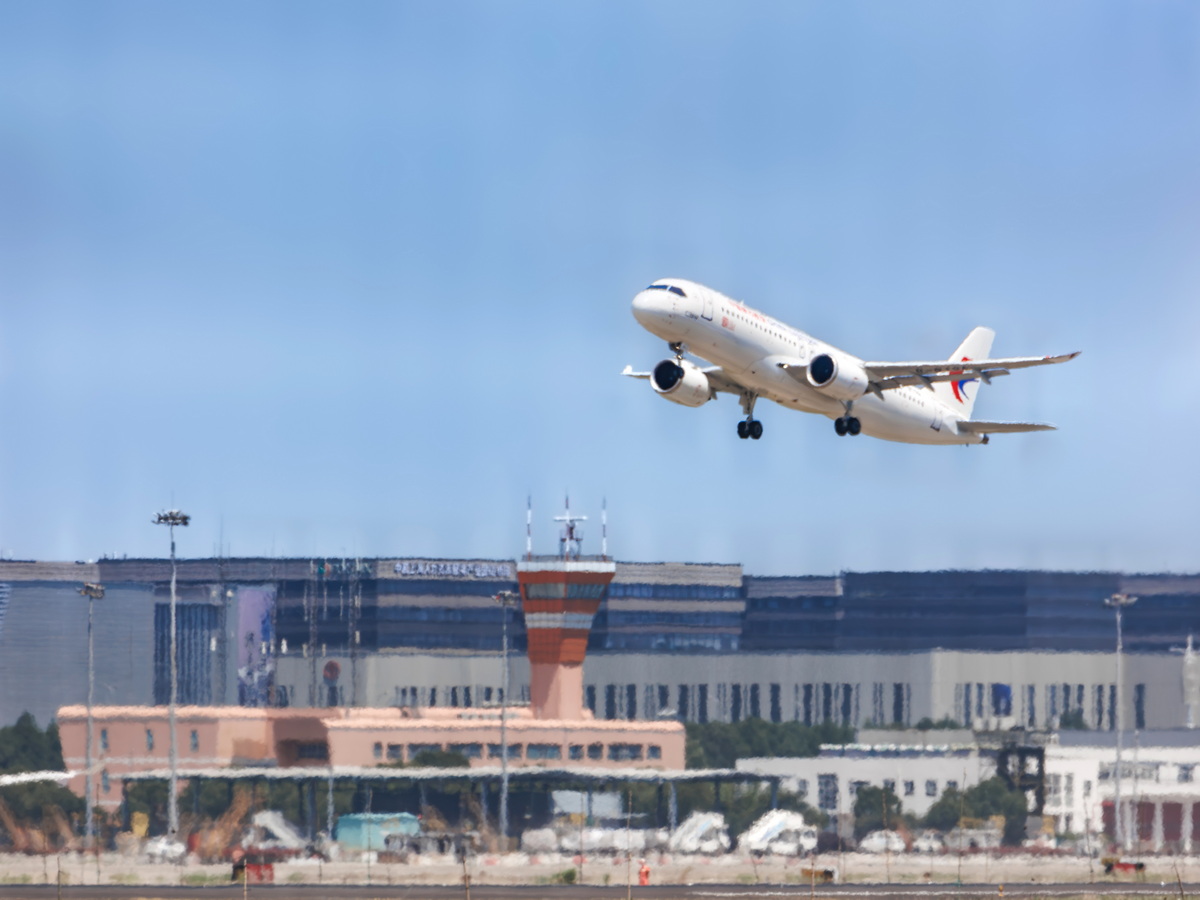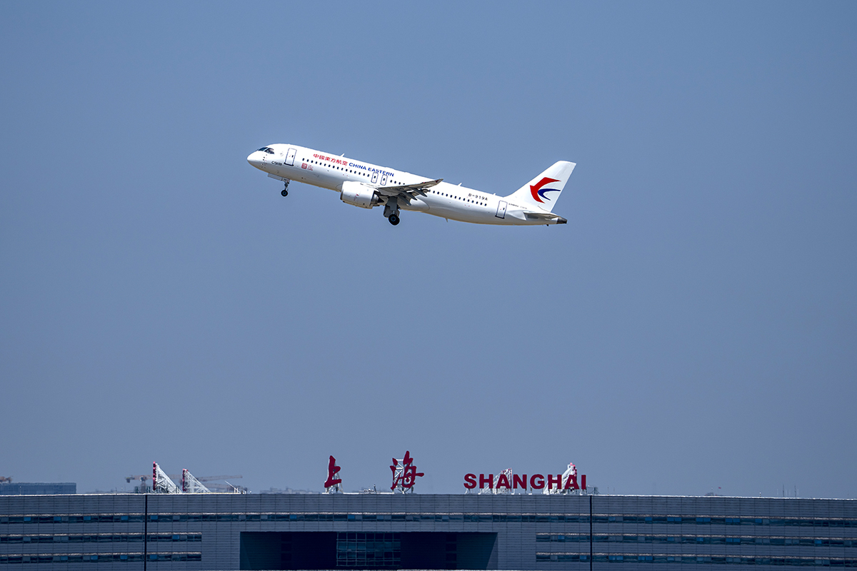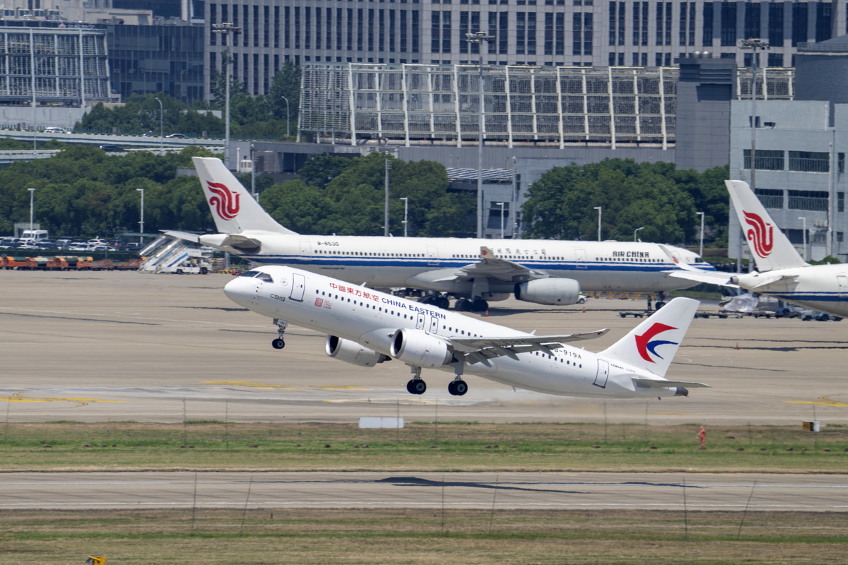 5月28日上午,C919客机在上海虹桥国际机场起飞瞬间。方晨/IPSHANGHAI图
