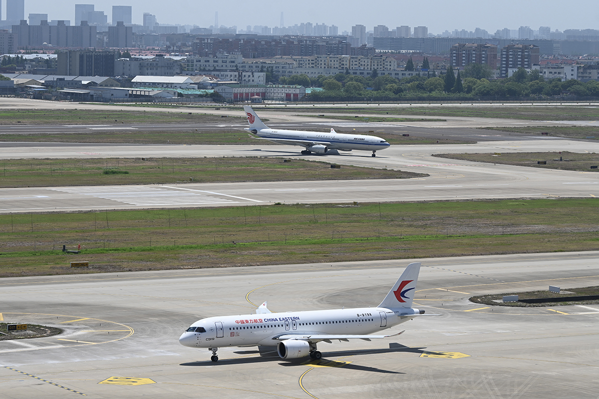 5月28日上午,C919客机在上海虹桥国际机场准备起飞。澎湃新闻记者朱伟辉图