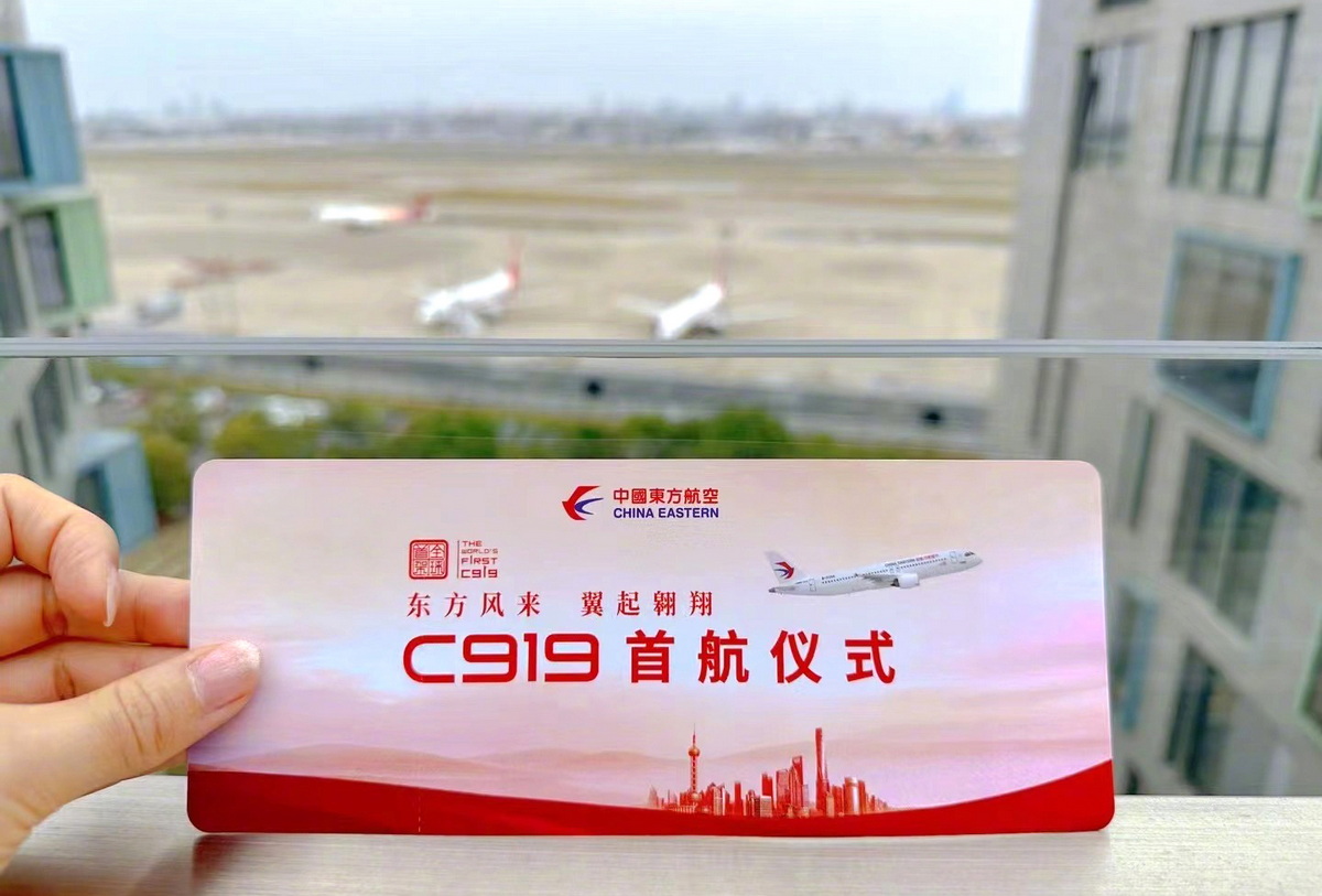 航班起飞前,东航在上海虹桥机场举行了隆重的首航仪式。同时,《中国东航C919首航》纪念邮资封也在仪式上揭幕。
