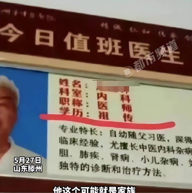 根据河南都市频道报道显示,该医生头发花白,所在科室为内科,职称为医师,但学历这一栏填的是“祖传”。另据医院官网介绍,该医生为中医内科医师,自幼随父习医,深得家传,具有几十年临床经验。专业特长为中医内科杂病、脾胃、肝胆、肺疾、肾病、小儿杂病、妇人之疾等,有自己独特的诊断和治疗方法。