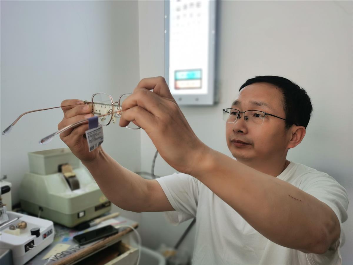 戴着眼镜,穿着白色T恤,年近50岁的王训桥手里拿着新的眼镜片,正在不慌不忙地给顾客配镜。