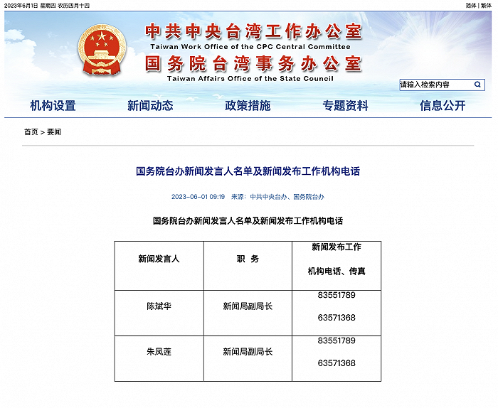 国台办官网6月1日发布“国务院台办新闻发言人名单及新闻发布工作机构电话”显示,陈斌华已任国台办新闻局副局长、发言人。