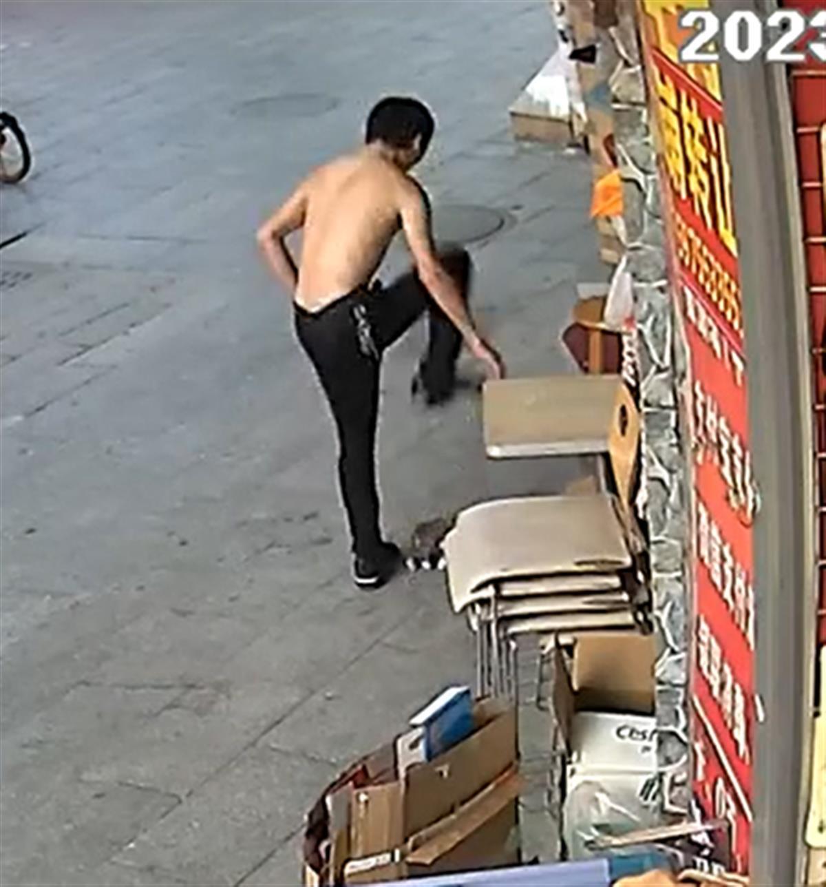 监控视频显示,一光着上身的男子,蹲在地上逗弄小猫后,突然站起来用脚狠狠地踩在小猫身上,小猫不停扭动抽搐。随后,男子迅速离开。