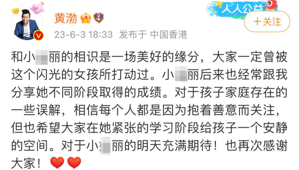 6月3日下午,黄渤发布微博称,和丽丽的相识是一场美好的缘分,“这个闪光的女孩”后来也经常跟他分享自己在不同阶段取得的成绩,“相信每个人都是因为抱着善意而关注,但也希望大家在她紧张的学习阶段给孩子一个安静的空间。”