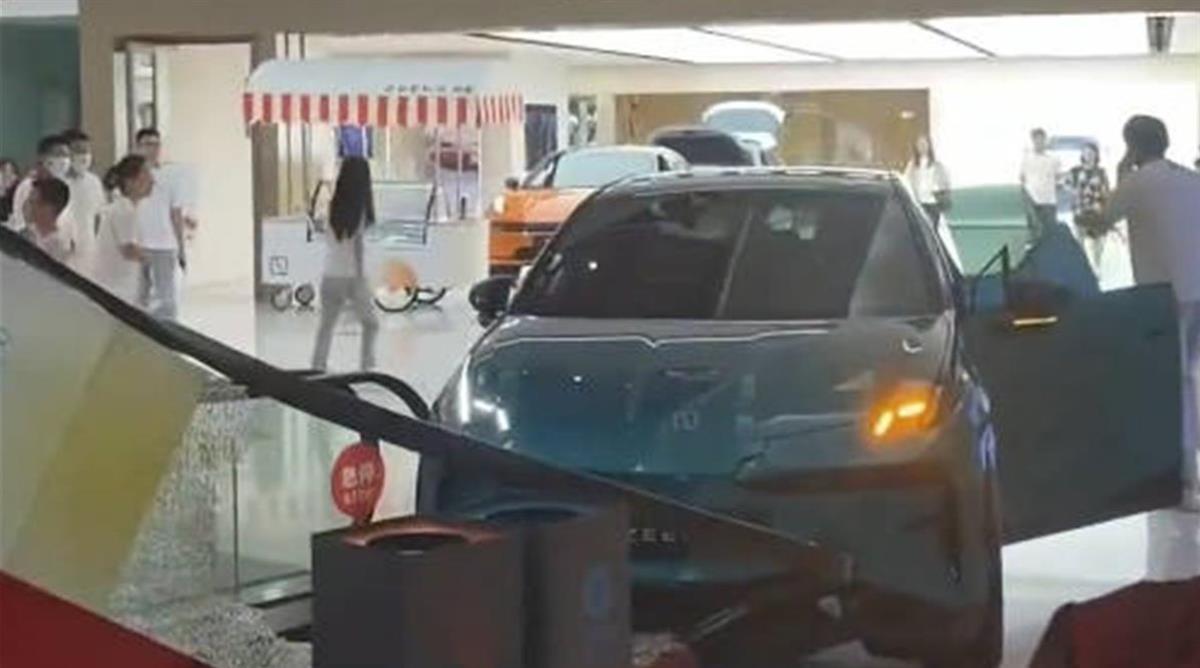 视频显示,一辆蓝色车辆撞到了商场的手扶电梯,车灯不停闪烁,车头部位疑似被撞裂,手扶电梯玻璃被撞碎。