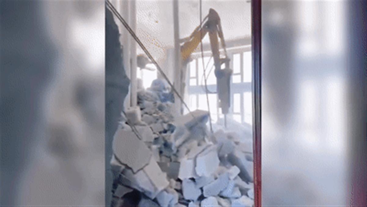 而更令人震惊的是,为了提升拆墙进度,施工方甚至将挖掘机械吊到二楼进行作业。