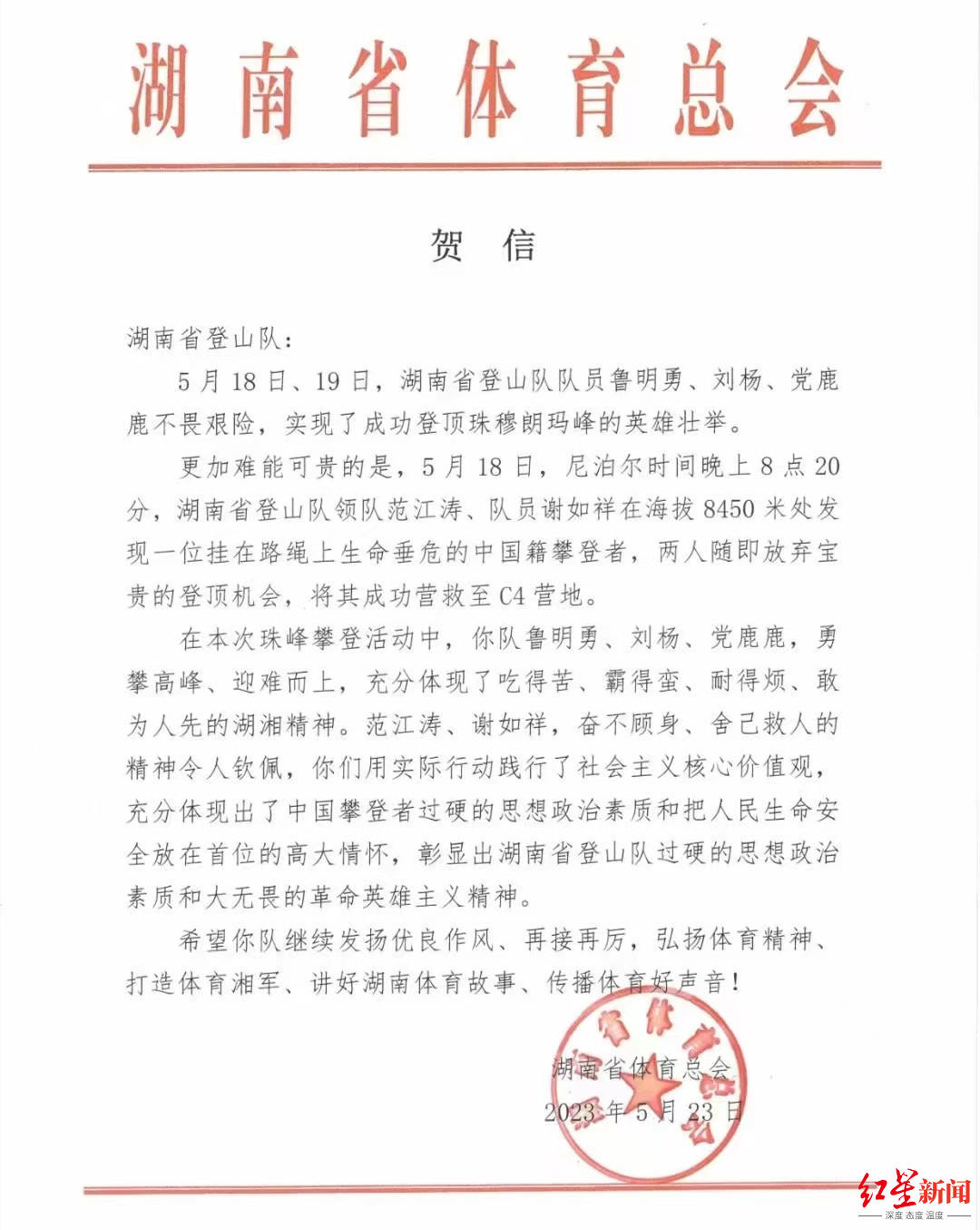 今年5月,湖南省登山队队员范江涛、谢如祥在距登顶珠峰不到400米时,为救助50岁女登山者刘女士放弃了登顶计划,这一举动引发广泛关注,湖南省体育总会也向湖南省登山队发出贺信,高度赞扬了两名救人队员奋不顾身、舍己救人的精神。
