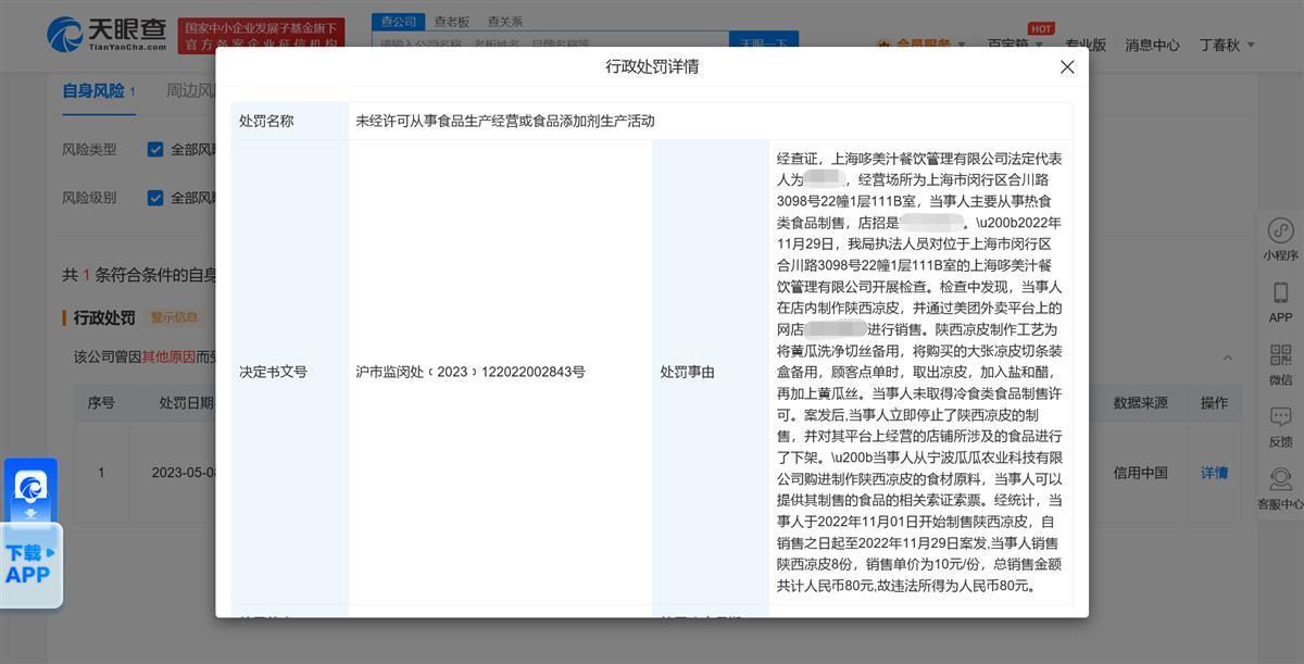 6月8日,极目新闻记者通过国家企业信用信息公示系统和天眼查发现,除前述的上海米帆餐饮管理有限公司金桥分公司外,上海市浦东新区金杨新村街道桌福小吃店、上海哆美汁餐饮管理有限公司也都因为售卖含黄瓜丝的凉皮,被罚款5000元。