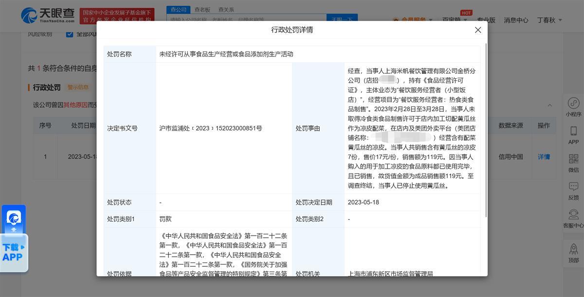 6月7日,有网传消息称,上海米帆餐饮管理有限公司金桥分公司因未经许可,从事食品生产经营或食品添加剂生产活动,被浦东新区市场监管局罚款5000元。具体违法事由为,当事人经营项目为“热食类食品制售”,在未取得冷食类食品制售许可的情况下,于店内加工切配黄瓜丝作为凉皮配菜,在店内及美团外卖平台经营含有配菜黄瓜丝的凉皮。当事人违反了食品安全法相关规定,被罚款5000元并没收119元。