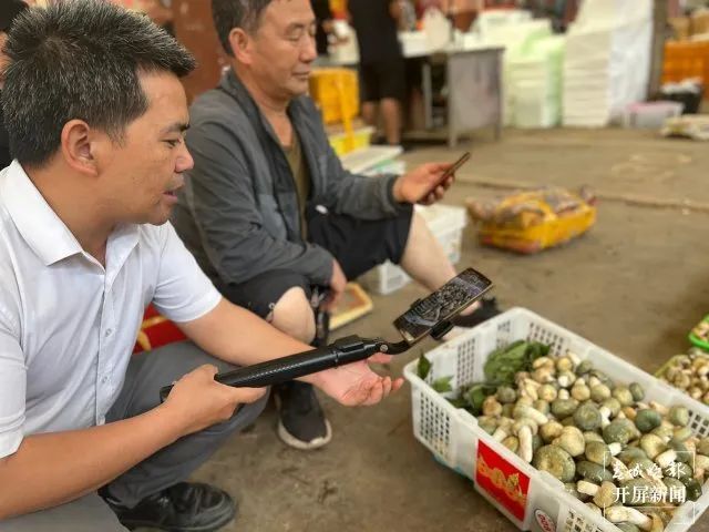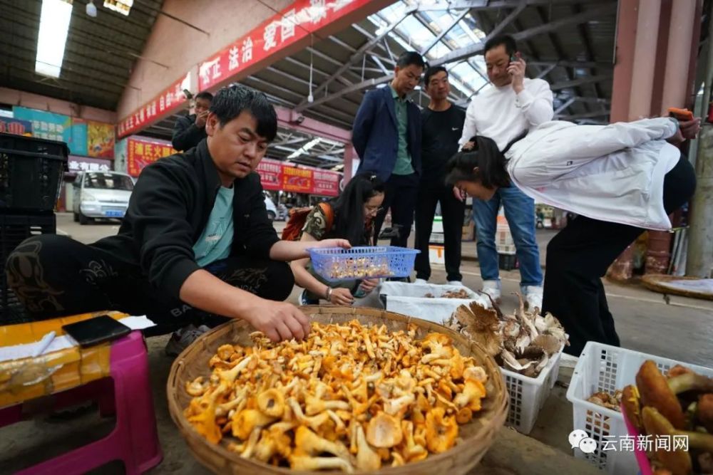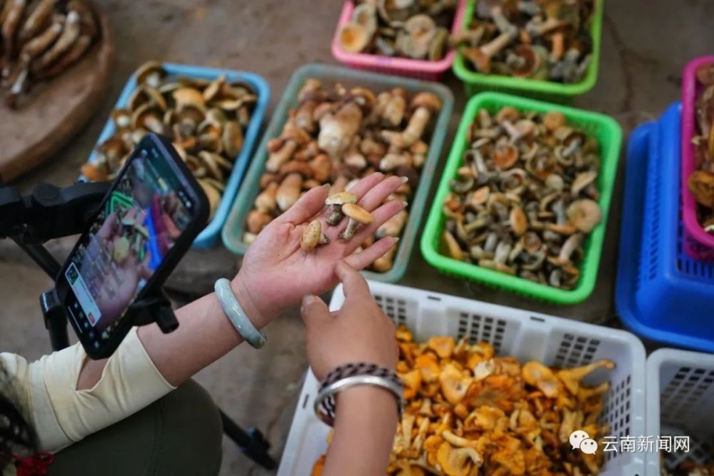 记者发现,市场里卖菌子的人多了,直播带货的主播也不少,他们抬着支架和手机,在直播间里展示、销售云南野生菌。
