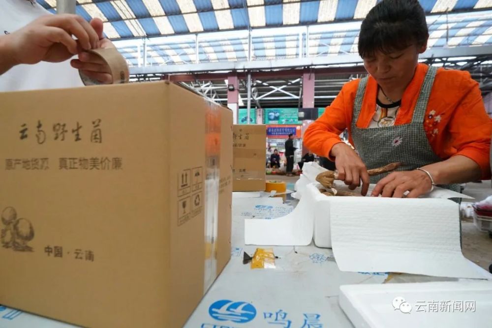 随着雨季的到来,野生菌将越来越多,包裹也就多起来了。去年快递包裹最多时,市场里单顺丰的快递员就有六七十人,还有其他公司的快递员。