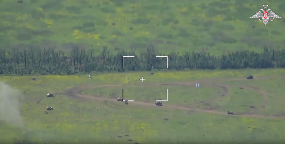 RT称,视频以多辆装甲车在扎波罗热前线某处开阔地带被炮火击中开幕。 图源:俄罗斯国防部视频截图