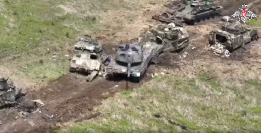 RT称,视频展示了多辆被摧毁的由西方国家提供的美制“布莱德利”步兵战车和“豹”式坦克。 图源:俄罗斯国防部视频截图