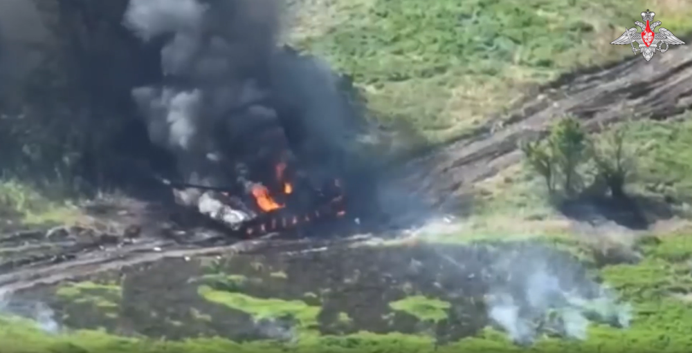 RT称,视频还展示了一辆“豹”式坦克在一条泥泞的小道上燃烧的片段。 图源:俄罗斯国防部视频截图