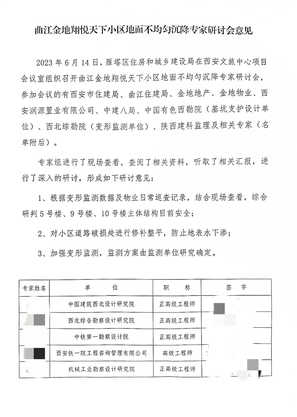 14日晚,陈先生等业主收到了物业工作人员发布的最新消息截图,称专家组进行了现场查看,查阅了相关资料,听取了相关汇报,进行了深入的研讨,形成了研讨意见。意见包括:根据变形监测数据及物业日常巡查记录,结合现场查看,综合研判5号楼、9号楼、10号楼主体结构目前安全;对小区道路破损处进行修补整平,防止地表水下渗;加强变形监测,监测方案由监测单位研究确定。