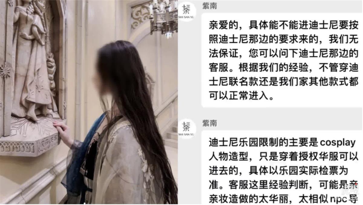 其次,该网友提及的这套衣服,是在知名汉服店购买的迪士尼联名款,这套衣服如果加上外面的“大袖”,汉服感就比较明显,也遮住了一些比较明显的角色元素,但是如果单穿裙子,其实不怎么像汉服,反而特别像迪士尼的公主裙。该店铺的售卖页面上有提及与迪士尼签署了品牌授权合作协议,但是并没有明示是否能穿进迪士尼,也有不少网友在问答区提问,究竟能不能穿进迪士尼,有网友也反映被工作人员要求换衣服。但买家秀中,也有买家晒出了穿着整套带“大袖”的服装在迪士尼拍照的照片,可见,同样的一套衣服,因为穿法不同,迪士尼的工作人员可能会在“是否属于装扮成角色造型”上,做出不同的判断,从而导致有的游客可以入园,有的游客无法入园,而这一点,售卖的商家并没有明确标注或提及。