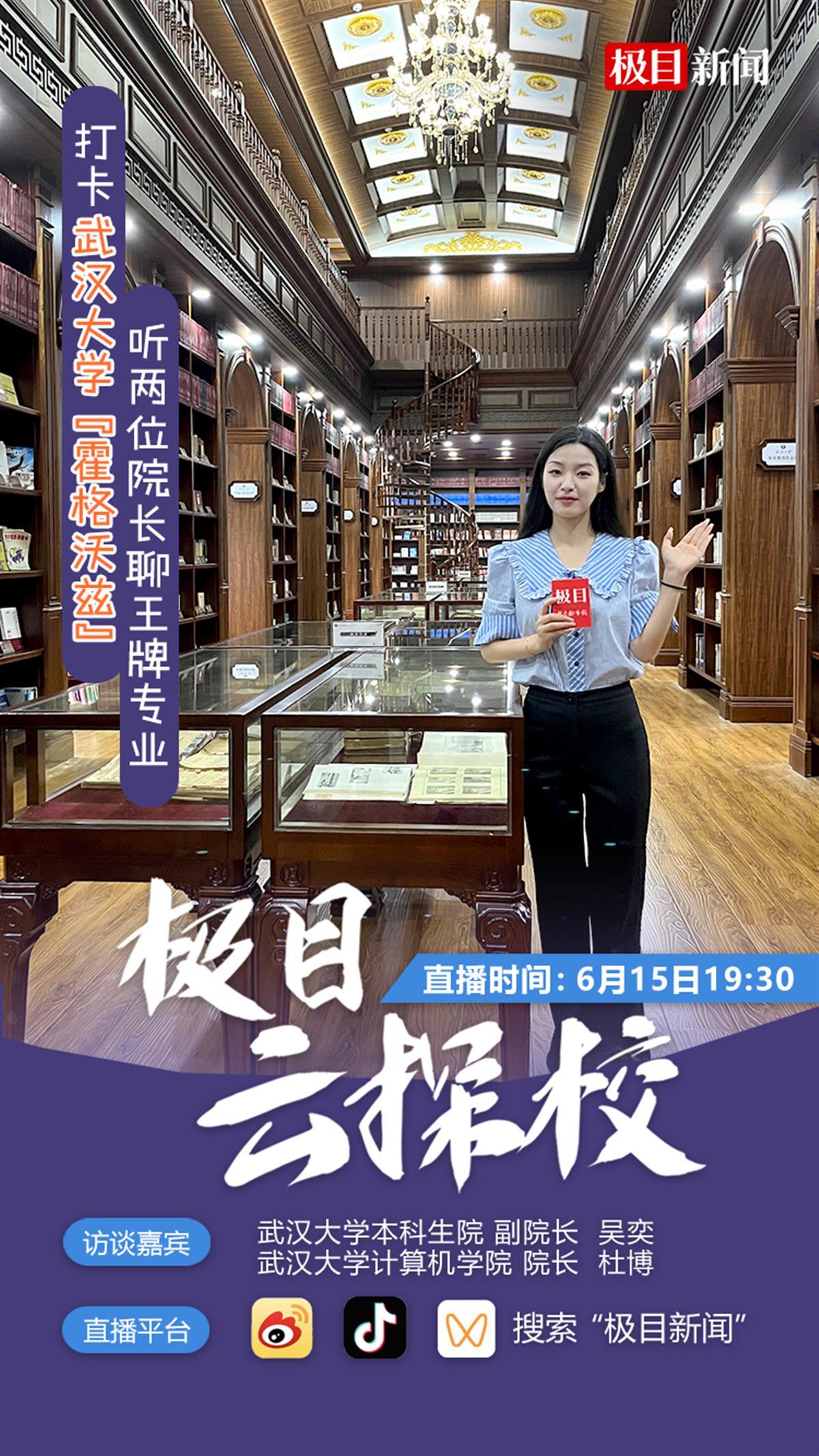 6月15日19:30,“极目云探校”节目将走进武汉大学,带领大家打卡该校新地标“珞珈文库”。同时,我们邀请到武汉大学本科生院副院长、招生工作处处长吴奕,武汉大学计算机学院院长杜博,介绍武大的王牌专业,为广大考生和家长填报高招志愿献上妙招。