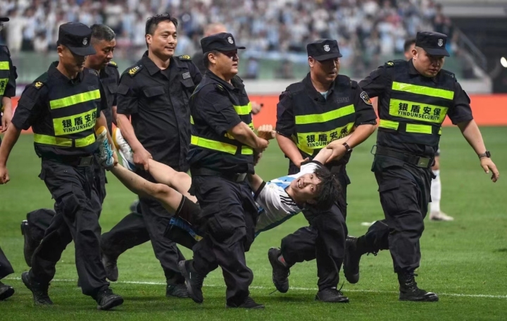 6月15日,梅西率领阿根廷国家队在北京工体和澳大利亚进行友谊赛。比赛现场气氛热烈,大小媒体长枪短炮,球迷狂热……竟然有一个球迷冲入工体球场拥抱梅西后,一路狂奔被保安控制抬出球场。