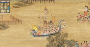 数艘华丽的龙舟沿江而下